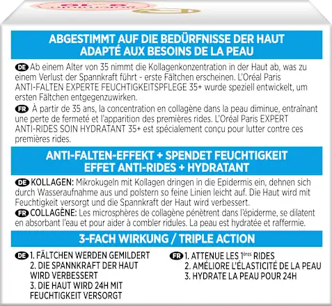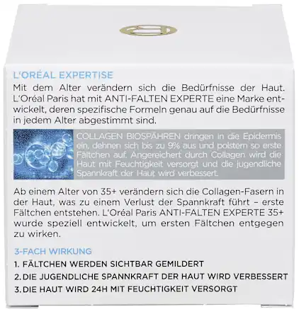 توضیحات محصول: برای پوستی سفت، مخملی و نرم: کرم ضد چروک لورآل پاریس مدل Anti-Wrinkle Expert 35+ به طور ویژه برایمقابله با اولین علائم چین و چروک طراحی شده است. بیوسفرهای کلاژن به اپیدرم نفوذ میکنند، تا 9٪ گسترش مییابند و بنابراین اولین چین وچروکها را پر میکنند. غنی شده با کلاژن، پوست را مرطوب کرده و خاصیت ارتجاعی جوانی آن را بهبود میبخشد.