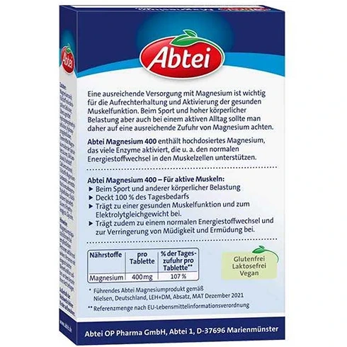 این محصول از برند آلمانی Abtei طراحی شده تا به افرادی که کمبود منیزیم دارند یا نیاز به حمایت بیشتر در عملکرد عضلات و سیستم عصبیدارند، کمک کند. منیزیم بهعنوان یکی از مواد معدنی ضروری بدن، نقشی کلیدی در بیش از 300 فرآیند بیوشیمیایی بدن ایفا میکند. قرصهایAbtei Magnesium 400mg به دلیل فرمولاسیون با دوز بالا، بهویژه برای ورزشکاران، افراد پرمشغله و کسانی که احساس خستگی یاضعف عضلانی دارند، ایدهآل است.قرص منیزیم 400 آبتی یکی از مکملهای محبوب و پرکاربرد در زمینه تأمین نیاز روزانه بدن به عنصر منیزیماست. منیزیم یکی از مواد معدنی حیاتی برای بدن است که در بیش از 300 واکنش بیوشیمیایی شرکت دارد و نقش مهمی در سلامت عضلات،استخوانها، سیستم عصبی و قلب ایفا میکند. استفاده منظم از قرص منیزیم 400 آبتی میتواند به بهبود عملکرد بدن و پیشگیری از کمبود اینعنصر مهم کمک کند.