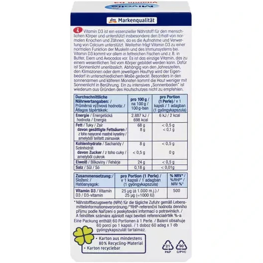 کپسول ویتامین D3 میوولیس حاوی ویتامین D3 آفتاب هستند. ویتامین D3 یک ماده مغذی ضروری برای بدن انسان است و به ویژه میتواند ازحفظ سلامت استخوانها و دندانها پشتیبانی کند، زیرا میتواند به جذب و استفاده از کلسیم کمک کند. علاوه بر این، ویتامین D3 میتواند بهعملکرد طبیعی عضلات و سیستم ایمنی بدن کمک کند.